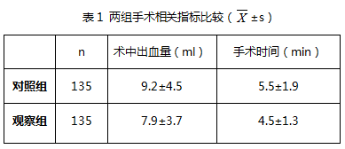 1.3 观察指标 观察并统计分析两组术中疼痛程度、出血量、手术时间情况,以及术后并发症和可接受情况。